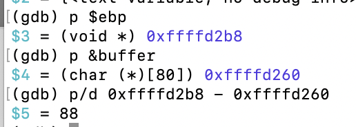 ebp 밑에 바로 버퍼가 있을 거라 ebp와 버퍼 위치 구해서 빼줌 => 88