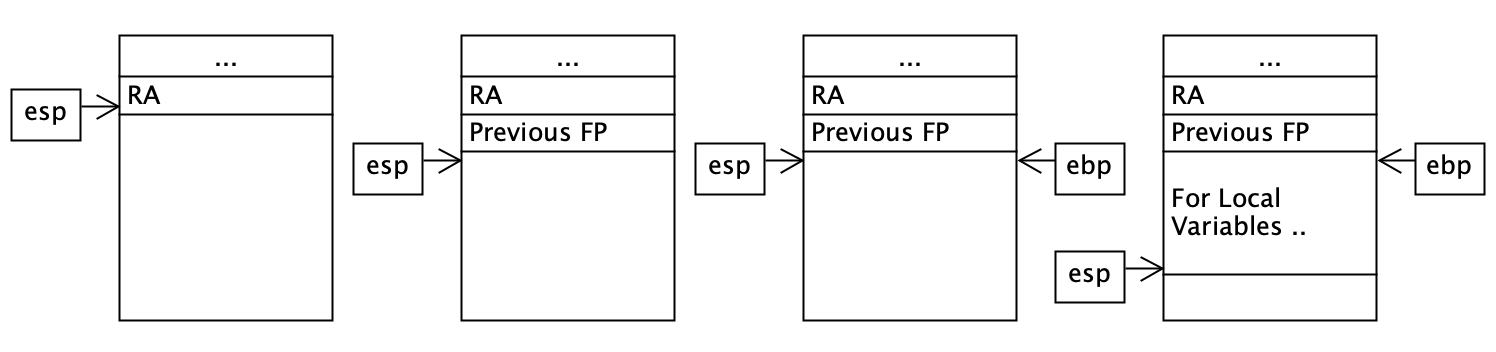 pushl %ebp : previous stack frame pointer(saved ebp)를 스택에 넣음