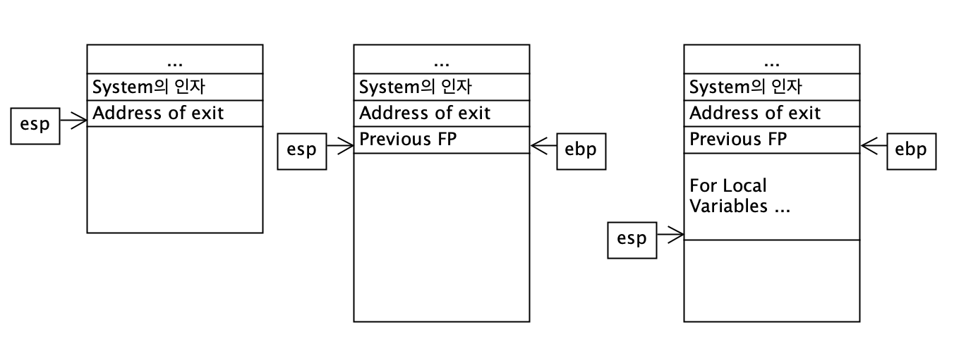 취약한 함수의 에필로그가 끝나자마자 system의 프롤로그가 불러짐