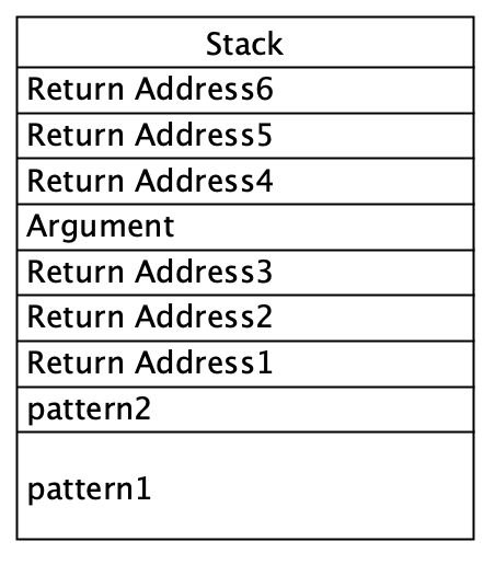 pattern1 + pattern2 + ret_addr_1 + ret_addr_2 + ret_addr_3 + Argument + ret_addr_4 + ret_addr_5 + ret_addr_6