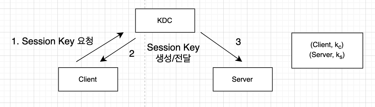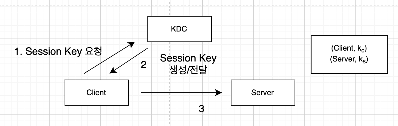 - Step2 : KDC는 세션키를 생성하여 클라이언트에게 전달 (Kc 이용하여 암호화해서 전달)