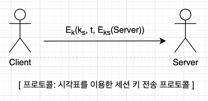 ks = 클라이언트가 생성한 세션키, t = timestamp, Eks(Server) = 세션 키로 암호화한 서버 ID