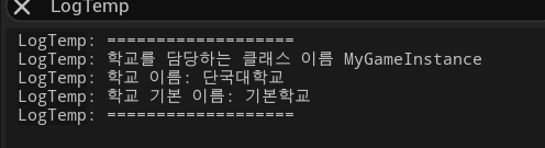 UE_LOG(LogTemp, Log, TEXT("학교 기본 이름: %s"), *GetClass()->GetDefaultObject<UMyGameInstance>()->SchoolName);