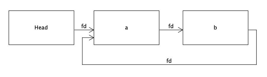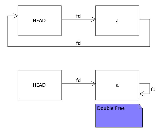 구체적인 형태는 구현에 따라 다르겠으나, 헤드와 포워드 포인터가 있는 서큘러 싱글 링크드 리스트 형태라 하면 더블 프리 발생 시 위 이미지와 같이 빈의 자료구조가 뒤틀리게 된다. 일반적인 상황에서는 빈에서 a를 뽑아서 쓰면 a가 가리키던 fd가 헤드를 가리키게 되면서 빈이 비었다는 것을 나타나게 되는데, 더블 프리 버그가 발생하면 a의 fd가 자기 자신을 가리키게 되며 메모리 할당 요청이 있으면 계속해서 a를 할당해주게 된다.