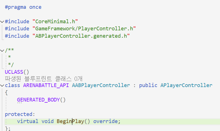플레이어 컨트롤러의 헤더파일인데, BeginPlay()를 오버라이드 해야 함