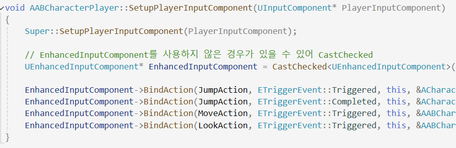 EnhancedInputComponent->BindAction(MoveAction, ETriggerEvent::Triggered, this, &AABCharacterPlayer::Move);