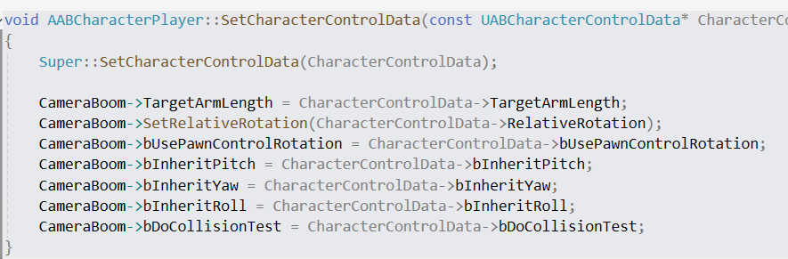 void AABCharacterPlayer::SetCharacterControlData(const UABCharacterControlData* CharacterControlData)