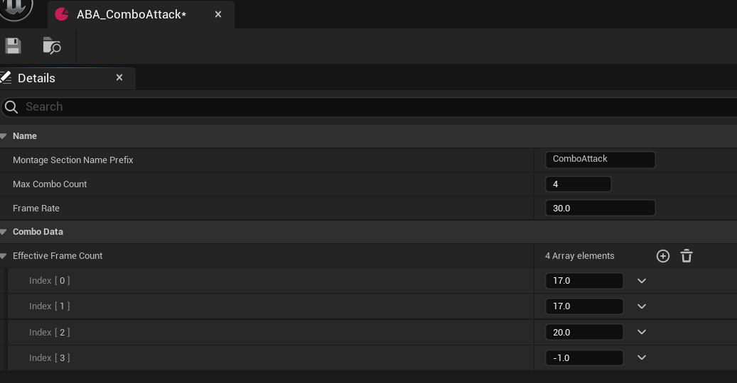 - 콤보 정보를 저장한 데이터 애셋 생성 (ArenaBattleCombo)