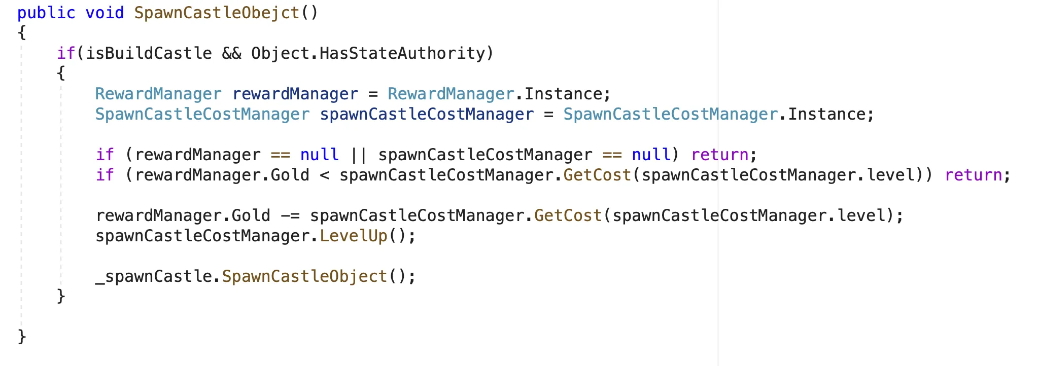 Player에서 리워드매니저에 접근해서 돈이 있는지 체크하고 캐슬 생성