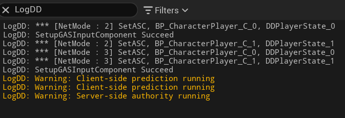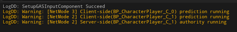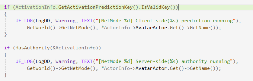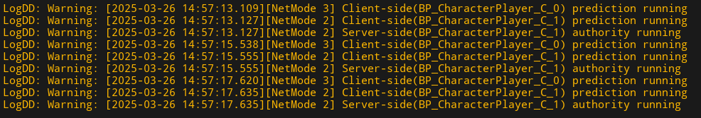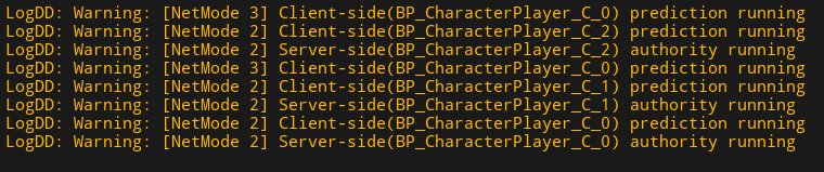 UE_LOG(LogDD, Warning, TEXT("[NetMode %d] Client-side(%s) prediction running"),