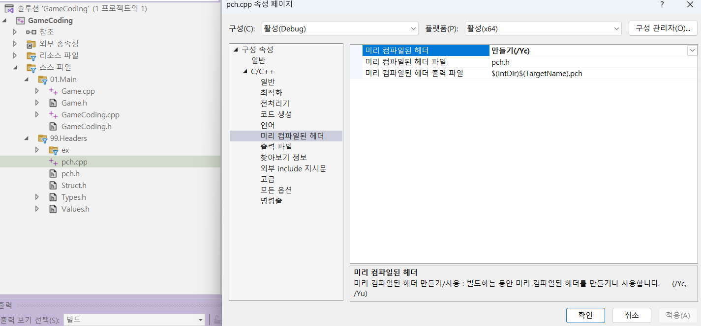 pch.cpp 속성 가서 pch에는 미리 컴파일된 헤더에서 만들기로 설정