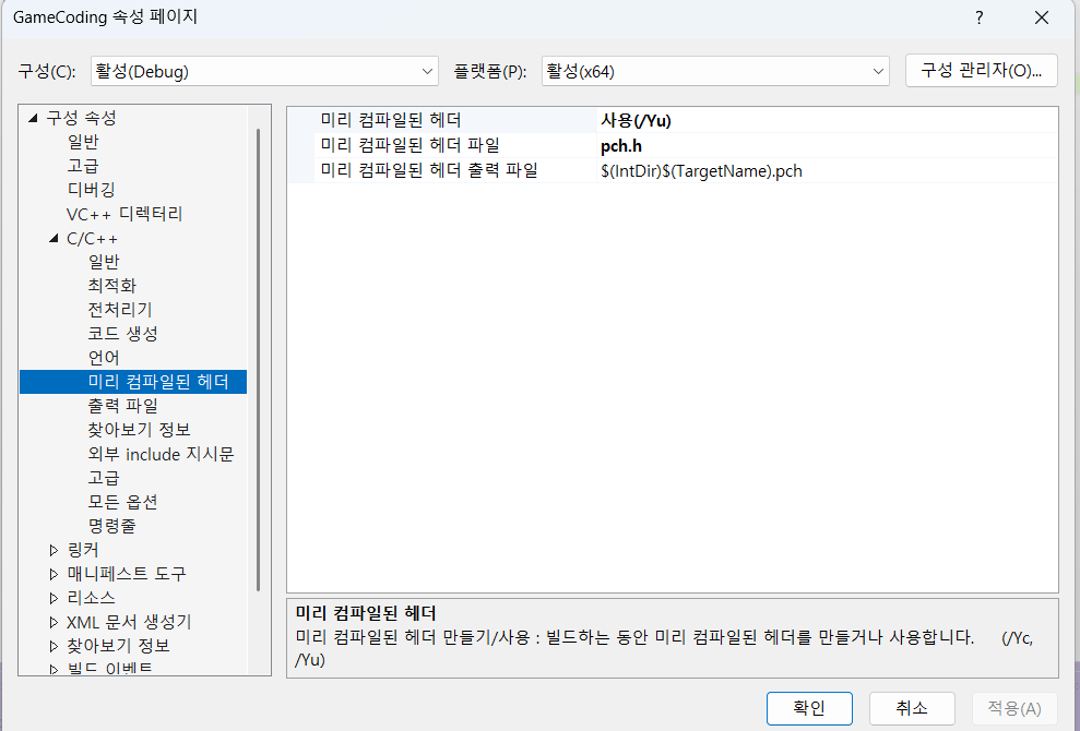 헤더 이름은 pch.h로 해주고