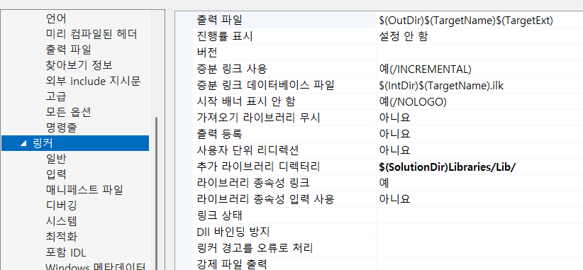 추가 파일, 링크할 라이브러리 파일 디렉터리 연결