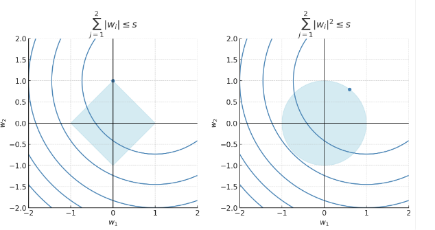 마름모, 원: 가중치가 가질 수 있는 범위, 타원과 만나는 점이 구하는 값