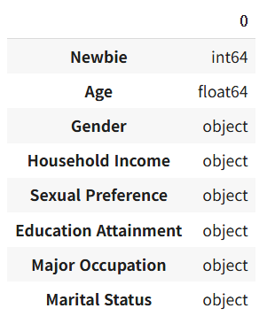 category_cols = ["Gender", 'Household Income', 'Sexual Preference', 'Education Attainment', 'Major Occupation', "Marital Status"]
