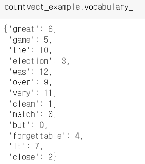 - 전체 문서에 있는 모든 단어들에 이미 인덱스가 부여되어 있고 출현한 단어에 대해서만 단어의 개수를 벡터로 표현
