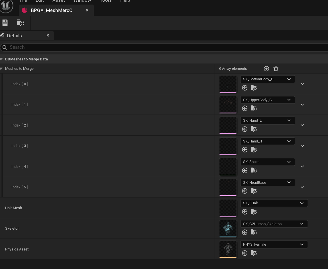 병합할 메시들 메시 정보와 헤어 메시, 스켈레톤, 피직스 애셋까지 보유