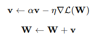 - : 모멘텀 계수 (보통 0.9 정도로 설정)