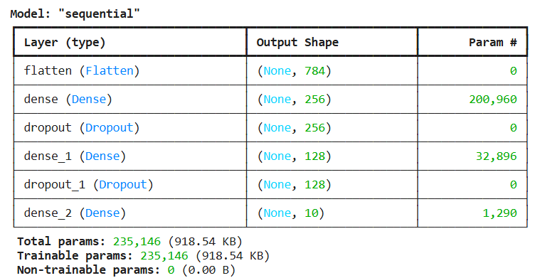 256 -> 드롭아웃 -> 128 -> 드롭아웃 -> 10
